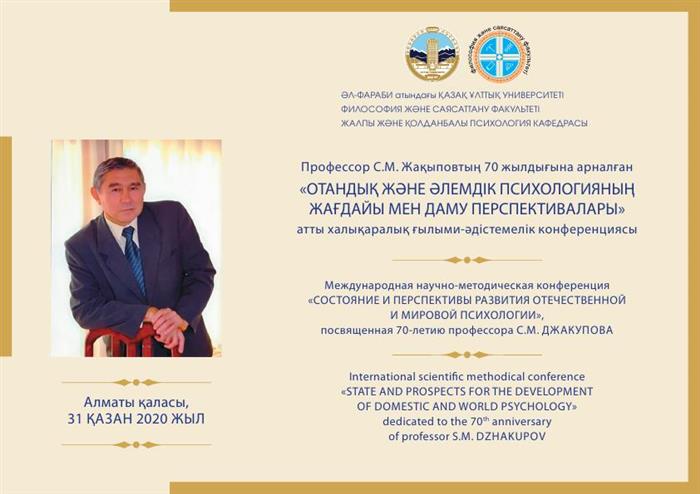 31 октября 2020 года в КазНУ имени аль-Фраби состоялась Международная научно-методическая конференция «Состояние и перспективы развития отечественной и мировой психологии», посвященная 70-летию профессора С.М. Джакупова.