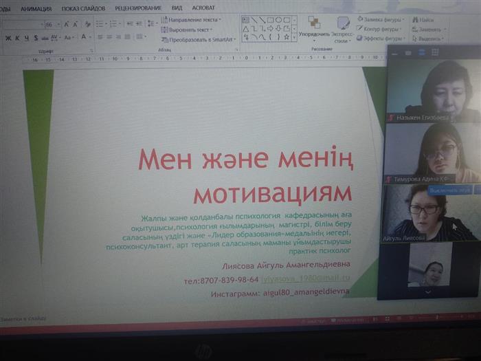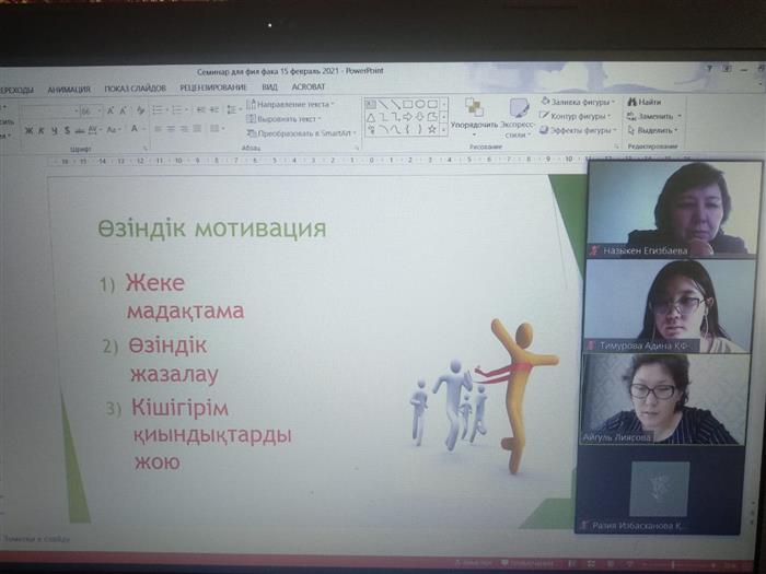 15 февраля 2021 года на кафедрах «Казахское языкознание» и «Общая и прикладная психология» Казахского национального университета имени аль-Фараби состоялась онлайн-встреча со студентами первого курса специальности «6В02305 - Казахская филология» на тему «Я и моя мотивация». Цель встречи – проанализировать психологическое состояние студентов в онлайн-обучении, выявить проблемы адаптации к обучению в условиях пандемии и показать пути их решения. Лиясова Айгуль Амангельдиевна, старший преподаватель кафедры общей и прикладной психологии, прочитала лекцию о влиянии образования в условиях пандемии на психологию студентов, источники энергии, способы получения мотивации, тайм-менеджмент, способы повышения стрессоустойчивости, принципы позитивного мышления. Студенты выразили благодарность за информацию, полученную во время встречи.