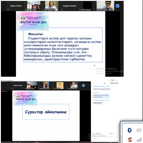 - 23 апреля 2021 года в рамках проекта "Айналаңды нұрландыр" был проведен круглый стол, воспитательное мероприятие на Республиканском национальном уровне "Жастар және дін". Участники круглого стола: специалист по религиоведению Центра изучения религий, магистрант 1 курса Евразийского национального университета Куатов Арулан; выпускник Египетского университета исламской культуры Нур - Мубарак, магистрант специальности Религиоведение 1 курса Казахского национального университета Сапарниязов Канат; студент специальности Религиоведение 4 курса Казахского национального университета Омаркул Али. В ходе круглого стола были рассмотрены темы: "Религия и молодежь: актуальность проблемы и пути решения», «Религия и молодежная субкультура», «Религия и воспитание», «Религия и традиции». Со стороны студентов были заданы вопросы по темам, были даны ответы. Особо впечатленные члены круглого стола, а также гости выразили свою благодарность организаторам мероприятия.