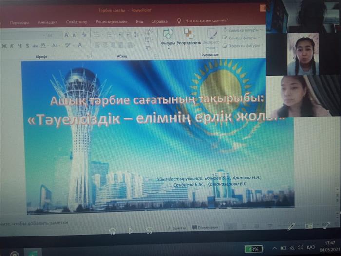 - 04.05.2021 г. в час. 12: 00 в честь 30 - летия Независимости Казахстана был проведен открытый воспитательный час на тему «Тәуелсіздік-Елімнің ерлік жолы». Студенты познакомились с победами нашей страны за годы независимости, доказали, что это страна, признанная миром, расширили свои знания и прочитали стихи на тему независимости, ответили на вопросы и поделились своими мыслями. Организатор: студенты 2 курса специальности Педагогика и Психология (1 группа), куратор Санбаева Б. Ж., Аринова Б. А., магистрант 1 курса Кожанарова Б. С