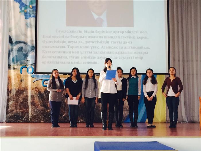 26 ноября 2015 г. в 14.00 часов, студенты 1 курса специальности социальная педагогика и самопознание проводили открытый кураторский час на тему: «Елімнің бағы - Елбасы». Мероприятие прошло в актовом зале факультета. Целью мероприятие являлось сформировать патриотическое сознание у студентов и пробудить любовь к Родине!