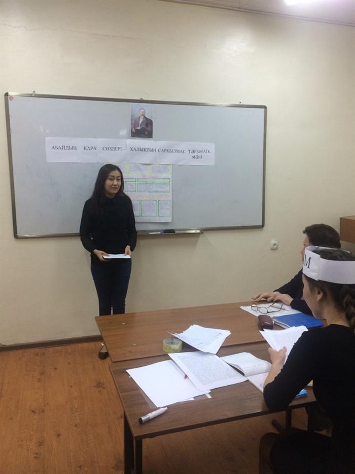 6 октября 2016 года в 8 лекционном зале факультета Филологии и мировых языков проведено воспитательное мероприятие на тему "Воспитательные значимые слова назидания Абая". Доцент кафедры педагогики т образовательного менеджмента Жолтаеғва К.Ж. организовала мероприятие в рамках проекта "100 книг".