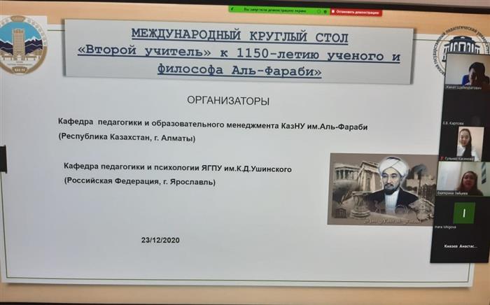 23 декабря 2020 года кафедра педагогики и образовательного менеджмента Казахского национального университета им. Аль-Фараби совместно с кафедрой педагогики и психологии Ярославского государственного педагогического университета им. К.Д. Ушинского провели Международный круглый стол , посвященный 1150-летию восточного философа, ученого Абу Насыра Аль-Фараби,имя которого носит наш университет. В работе Круглого стола приняли участие преподаватели и магистранты КазНУ им. Аль-Фараби и ЯГПУ им. К.Д.Ушинского. Во время проведения Круглого стола были заслушаны доклады магистрантов КазНУ Ишиговой Инары на тему «12 качеств истинного правителя по Аль-Фараби», Салыковой Алии на тему «Идеи Аль-Фараби об искусстве управления », Ма Ханьсюэ на тему «Восточный мыслитель Аль-Фараби в Китае», и доклады магистрантов ЯГПУ Калачевой Элизабеты на тему «Психологические воззрения Аль-Фараби»,Прокофьевой Александры на тему « Педагогические идеи Аль-Фараби». По итогам проведения Круглого стола было принято решение о публикации сборника докладов магистрантов КазНУ им. Аль-Фараби и Ярославского государственного педагогического университета им. К.Д. Ушинского. В юбилейный год университетом было проведено много значимых мероприятий на республиканском и международном уровнях, при университете функционирует Центр «Аль-Фараби», Бизнес-школа Аль-Фараби.