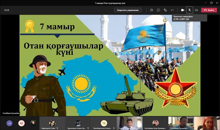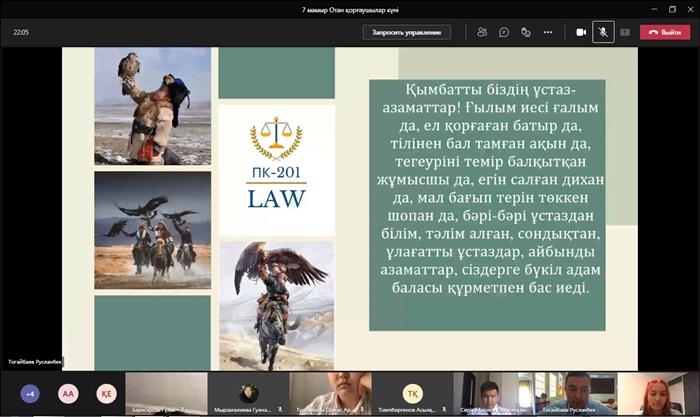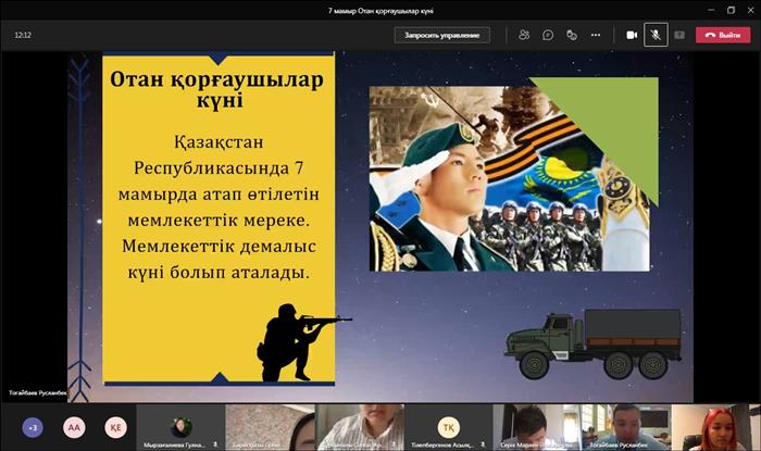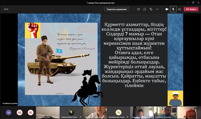 05.05.2021 года на факультете довузовского образования прошел круглый стол "7 мая - День Вооруженных Сил Республики Казахстан!", с группой ПК-201 Тогайбаев Р. М. провел кураторский урок (онлайн). В кураторском часе приняли участие декан факультета Жаппасов Ж. Е., заместитель Амирканов М. Б., директор колледжа Нурканова Р. О., заместитель Егеубаев А. А.