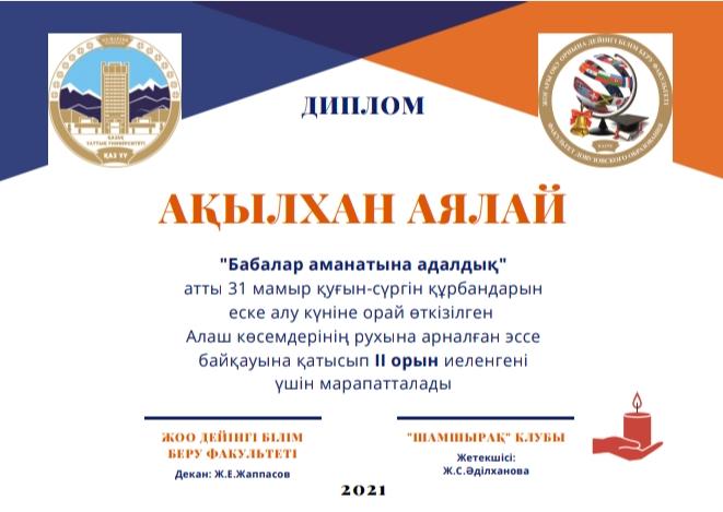 Победители конкурса эссе «Верность наследию предков!», которое состоялся 31.05.2021года посвященного памяти жертв репрессий вождей Алаша.