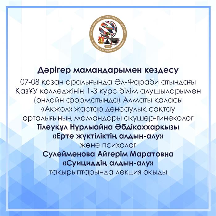 С 07 по 08 октября с обучающимися 1-3 курсов колледжа КазНУ им. Аль-Фараби (на онлаин формате) специалисты Молодежного центра здравоохранения «Акжол» г. Алматы провели лекцию на тему: «Профилактика ранней беременности» - акушер-гинеколог Тілеуқұл Нұрлыайна Әбдікаххарқызы, «Профилактика суицида» - психолог Сулейменова Айгерим Маратовна.