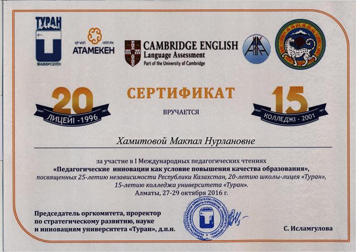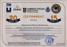 27-29 октября 2016 г. преподаватели колледжа КазНУ имени аль-Фараби приняли участие в работе І Международных педагогических чтениях на тему: "Педагогические инновации как условие повышения качества образования".