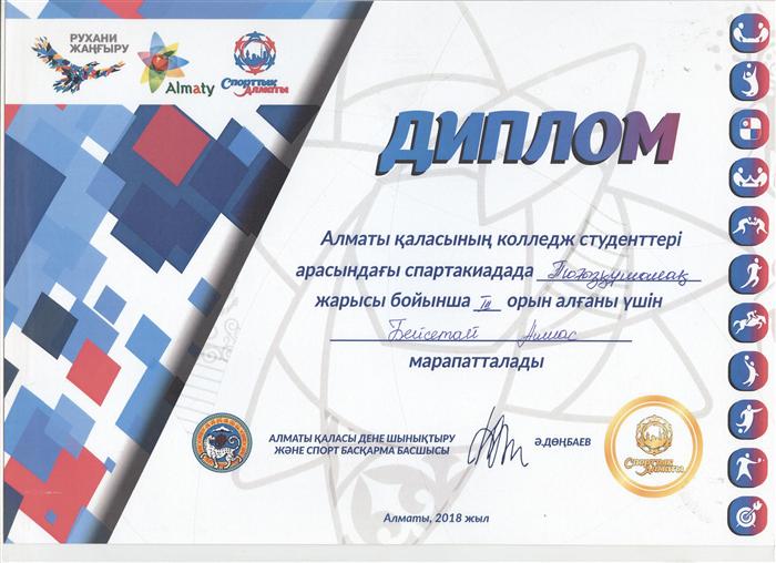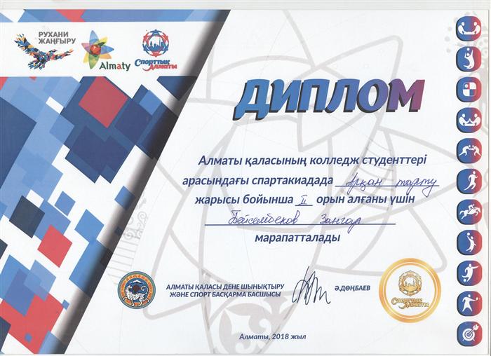 18.02.2018 под лозунгом «Рухани жаңғыру» и в поддержку программы «Спортивный Алматы» среди колледжей Алматы прошла спартакиада по таким видам спорта как: перетягивание каната, тоғызқұмалақ, шахматы, армрестлинг, поднятие гирей, мини-футбол. В спартакиаде учавстовали студенты 1х-3х курсов и заняли призовые места. По перетягиванию каната заняли 2 место, учавстовавшие студенты: Сауытбек Тұрар, Көңілқос Жасталап, Бигалиев Исмаил, Бейсембеков Заңғар, и по тоғызқұмалақ 3е место, Бейсетай Алмас.