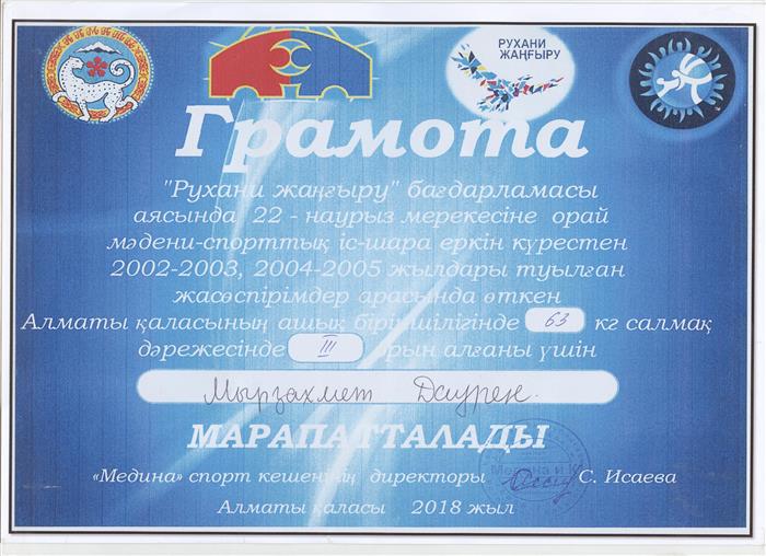 01.04.2018г. студент группы ПДК-105 Мырзахмет Даурен под лозунгом проекта "Рухани Жангыру" в открытом турнире по вольной борьбе города Алматы выиграл 3-е место.
