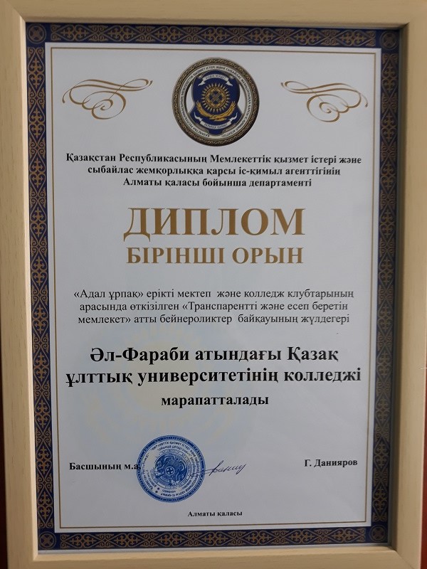 Колледж КазНУ имени аль-Фараби выиграл почетное І место в конкурсе видеороликов на тему: «Траспарентное и подчетное государство» среди колледжей г.Алматы.