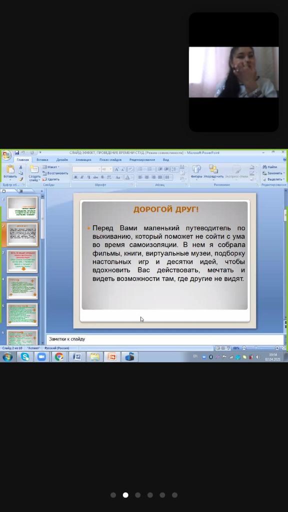 2 апреля 2021 года для студентов 2,3 курса колледжа был проведен дистанционный психологический тренинг в формате ZOOM между казахскими и русскими группами на тему: «Эффективное проведение времени студентов в онлайн-обучении». В ходе тренинга были даны важные советы по эффективному проведения времения вовремя карантина, правильному питанию, физическим упражнениям, личностному развитию, развитию рукоделия, чтению литературы разных жанров и просмотру фильмов.