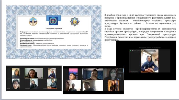 8 декабря 2020 года в 13:00 кафедра уголовного права, уголовного процесса и криминалистики юридического факультета КазНУ им. аль-Фараби провела онлайн-встречу старшего прокурора прокуратуры Ауэзовского района г. Алматы со студентами 3-4 курса.