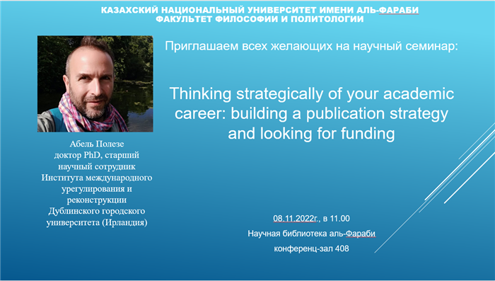8 ноября 2022 года, в 408 конференц-зале научной библиотек аль-Фараби, кафедра политологии и политических технологий провела академический научный семинар ‘Thinking strategically of your academic career: building a publication strategy and looking for funding’. Спикерами семинара выступили: декан факультета философии и политологии, ассоциированный профессор Мейрбаев Бекжан Берикбаевич, доктор политических наук, профессор Насимова Гульнар Орленбаевна, приглашённый преподаватель доктор PhD, старший научный сотрудник Института международного урегулирования и реконструкции Дублинского городского университета (Ирландия), Абель Полезе.