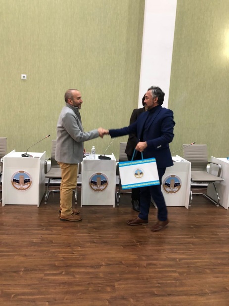Декан Бекжан Мейрбаев торжественно вручил Абелю Полезе сувенир КазНУ, а Абель Полезе подарил декану свои книгу «the (il)logics of academic survival».