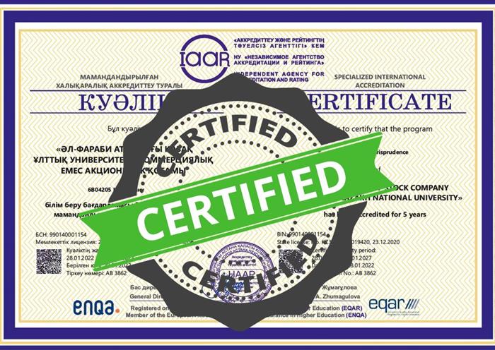 В конце декабря 2021 г. юридический факультет Казахского национального университета имени аль-Фараби по образовательной программе «Юриспруденция» прошел международную аккредитацию Независимого агентства аккредитации и рейтинга IAAR. Срок – 5 лет. Это бакалавриат, магистратура и докторантура. В течение недели международные эксперты посетили занятия на юридическом факультете, беседовали со студентами, преподавателями, сотрудниками, магистрантами, докторантами.