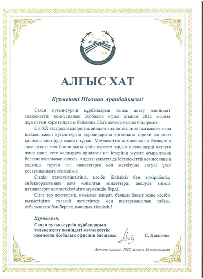 Также по результатам работы за прошлый год была отмечена д.ю.н. Забих Шолпан Арапбайқызы, как руководитель научной рабочей группы по изучению, подготовке заключения и рекомендаций по реабилитации категории деятели «Алаш». При этом в "Алғыс хат" отмечено, что Шолпан Арапбайқызы внесла весомый вклад в восстановление исторической справедливости, возвращению имен тех людей, которые без вины были подвергнуты жестоким репрессиям в начале ХХ века, попав под жернова сталинской политики уничтожения цвета нации. Ученые кафедры вносят свой вклад в работу государственных программ по полной юридической и политической реабилитации жертв политических репрессий.