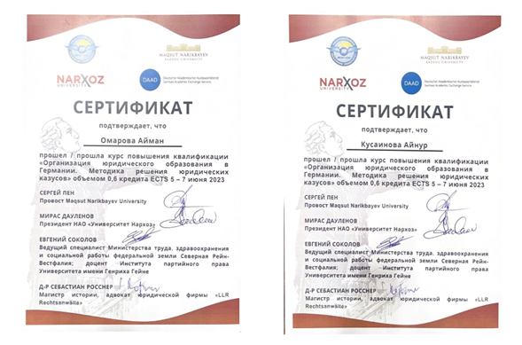 С 5 по 7 июня 2023 года Дюссельдорфский университет имени Генриха Гейне совместно с Центром немецкого права Университета КАЗГЮУ имени М.С. Нарикбаева, Университетом Нархоз и при финансовой поддержке DAAD провели курс повышения квалификации «Организация юридического образования в Германии. Методика решения юридических казусов».
