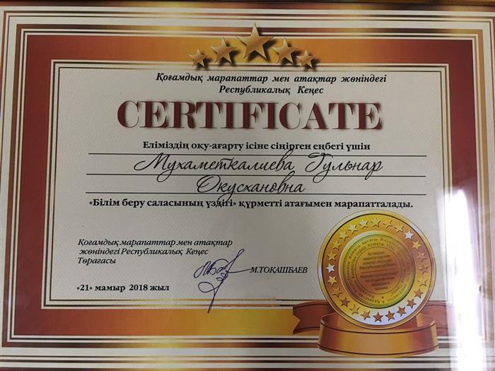 Сертификат МОН РК за особые заслуги в области образования награждается Мухаметкалиева Гульнар Окусхановна