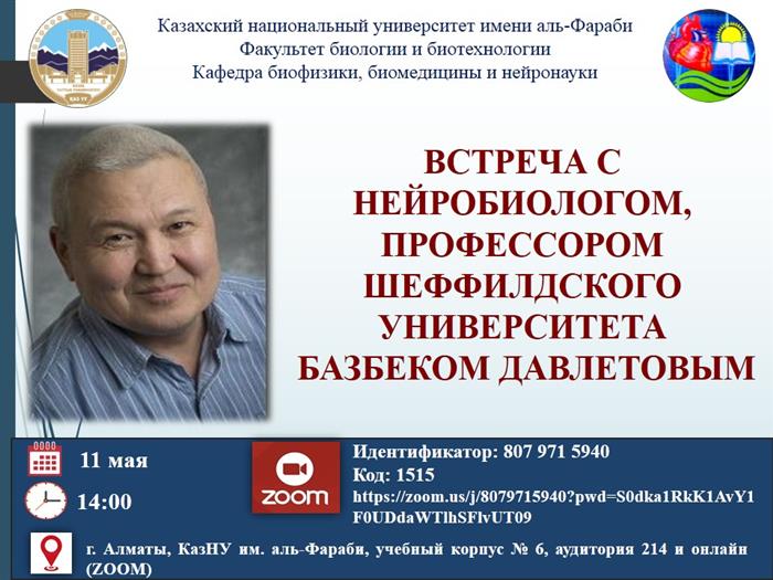 11 мая в 14:00 на платформе ZOOM состоится онлайн-встреча студентов, магистрантов и PhD докторантов кафедры биофизики и биомедицины с профессором Шеффилдского университета Базбеком Давлетовым.