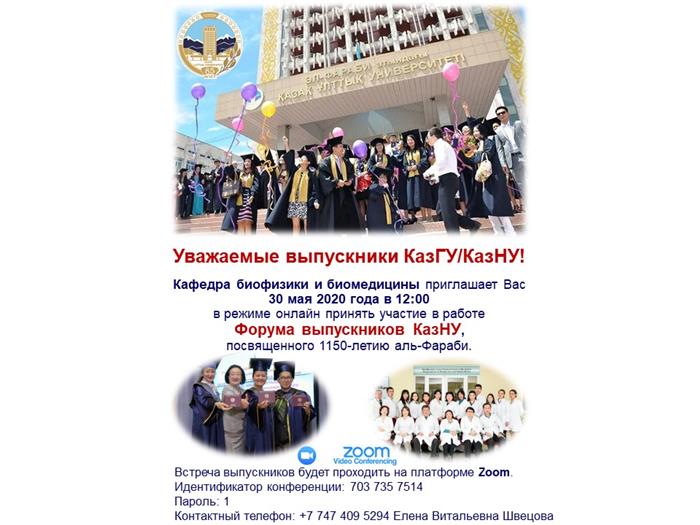 Кафедра биофизики и биомедицины приглашает Вас 30 мая 2020 года в 12.00 принять участие в работе Форума выпускников КазНУ, посвященного 1150-летию аль-Фараби.