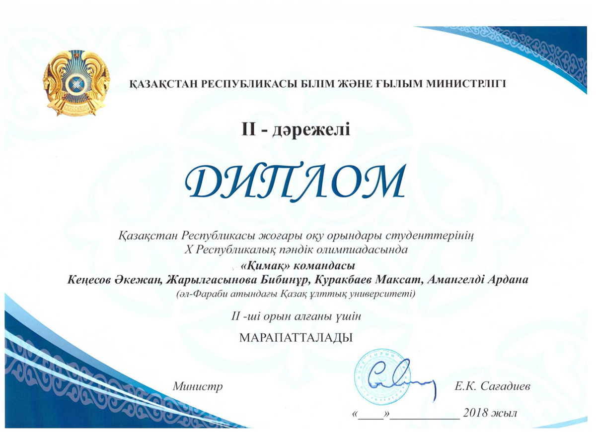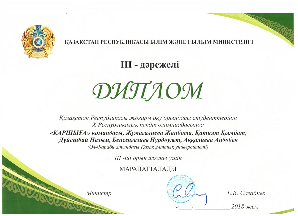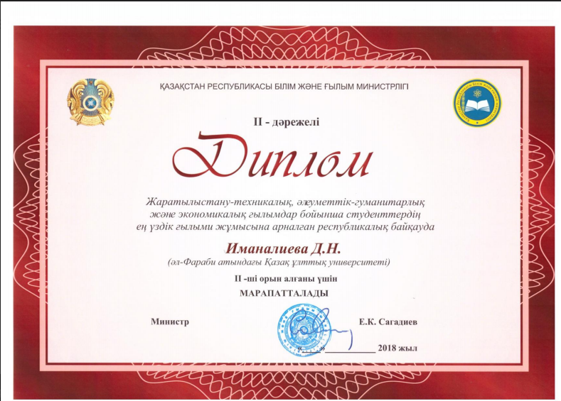 Студентка 4 курса специальности «Музейное дело и охрана памятников» в Республиканском конкурсе на лучшую научную работу в области естественных, технических, социальных и гуманитарных наук заняла: Иманалиева Дана 2 место