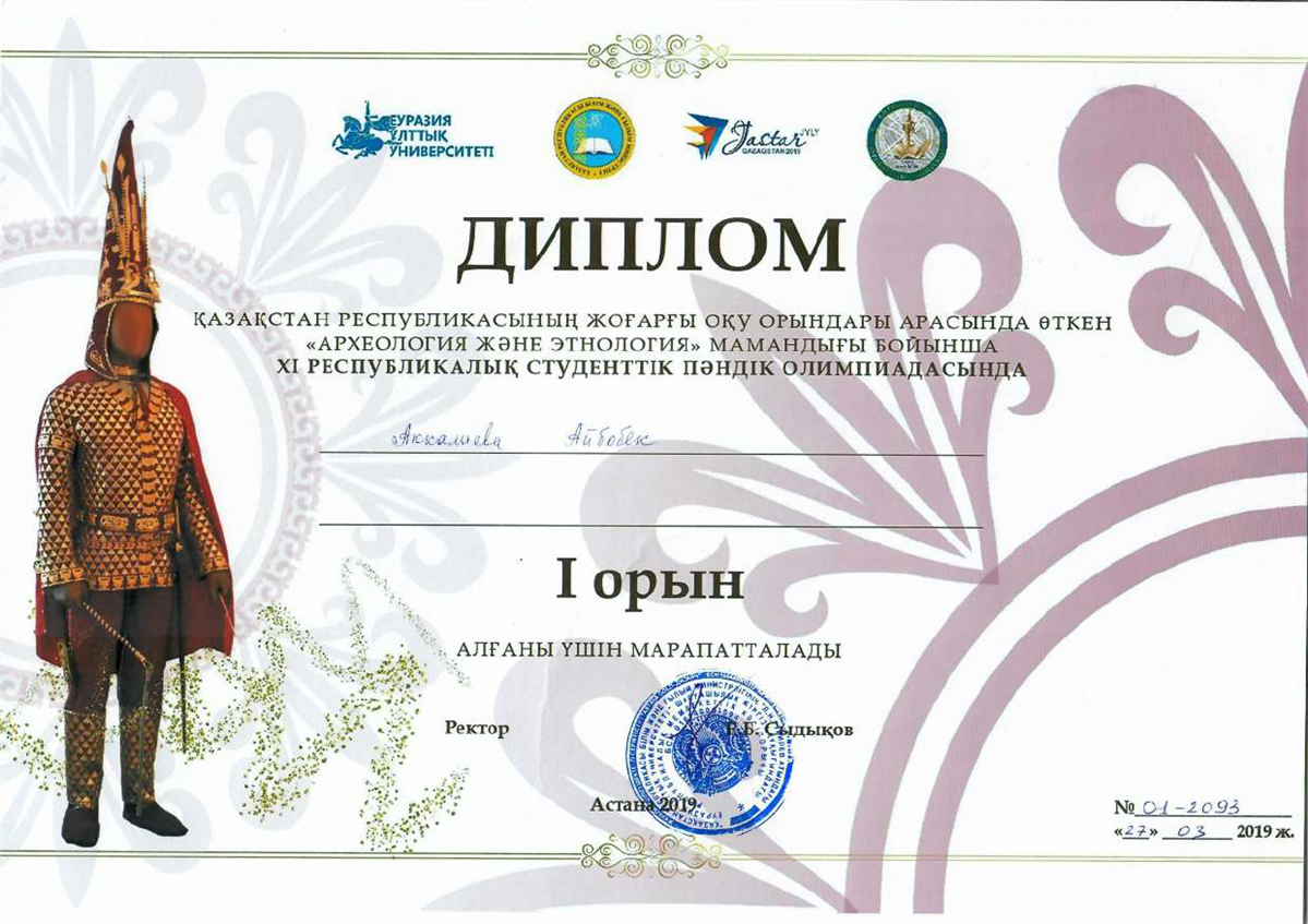 27.03.2019Студентка специальности «Археология и этнология» Аккалиева А., заняла 1 место в республиканской предметной олимпиаде среди студентов