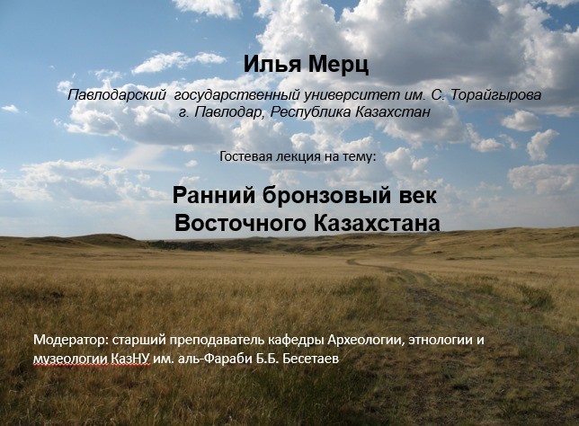 18.11.2020 Подробнее >>Казахском национальном университете им. аль-Фараби состоялась онлайн гостевая лекция И.В. Мерц, к.и.н., научного сотрудника Павлодарского государственного университета им. С. Торайгырова на тему: «Ранний бронзовый век Восточного Казахстана»