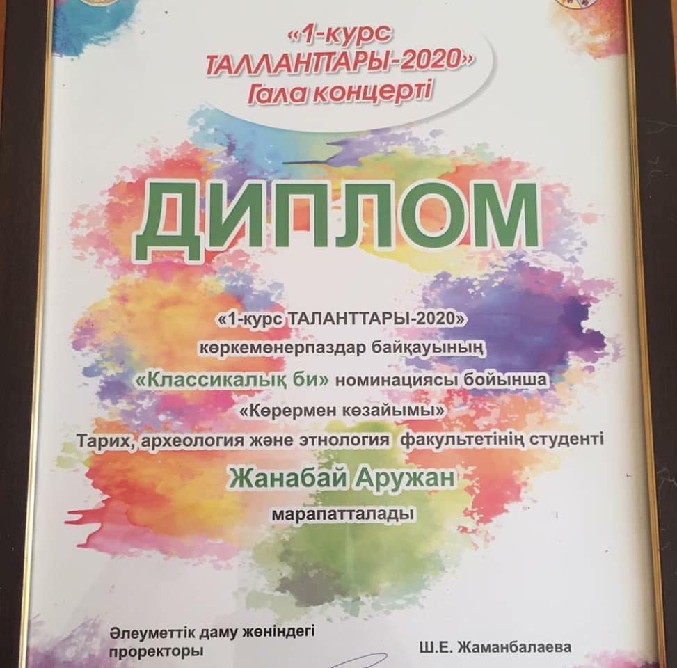 12.11.2020В конкурсе художественной самодеятельности" Таланты 1 курса-2020 "студент кафедры археологии, этнологии и музеологии Жанабай Аружан стал победителем в номинации" Классический танец".
