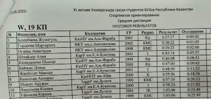 Жумагуль, опередив своих соперниц практически на 1 минуту, стала чемпионкой XI-й летней универсиады среди студентов ВУЗов Республики Казахстан на средней дистанции спортивного ориентирования!