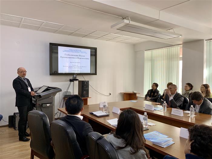 Свой взгляд на обсуждаемую тему представил приглашенный спикер - профессор университета МакГилл (Канада) Даулетбаев Н.Б., где отразил преимущества и перспективы глобализации науки, в том числе глобализацию науки как возможность для быстрого развития промышленного и научного потенциала, глобальную «рецензию» национальных работ зарубежными коллегами, глобальную кооперацию над масштабными и ресурсоемкими проектами, глобальные научные и профессиональные сообщества как «рупор» мнения ученых.
