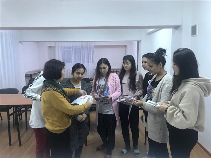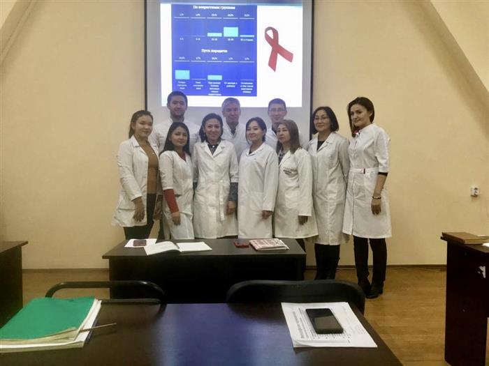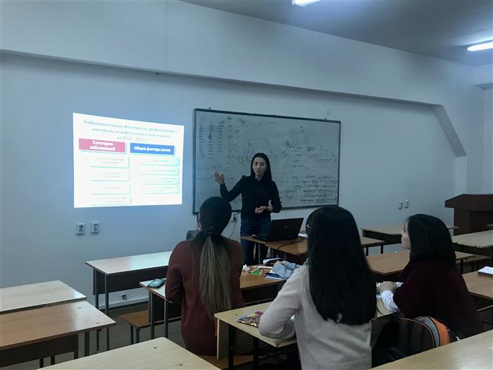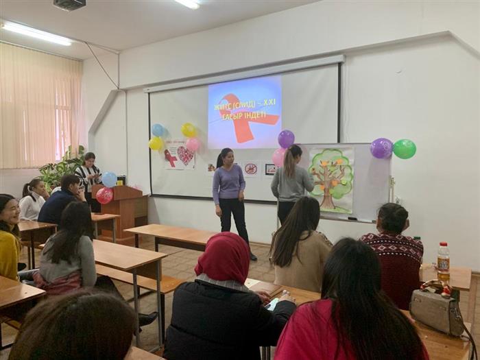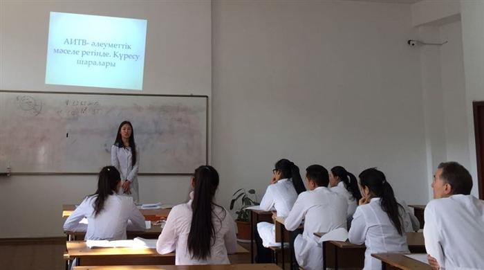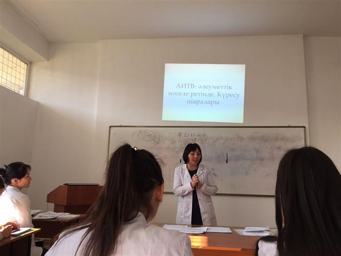 Докторант PhD Мукажанова Айнагуль и магистранты 2 курса специальности «Общественное здравоохранение» кафедры эпидемиологии, биостатистики и доказательной медицины факультета медицины и здравоохранения КазНУ им.аль-Фараби Касимов Сергей, Кабанбаева Гульшат, Касабекова Лена в рамках педагогической практики проведели воспитательное мероприятие "Что мы знаем о ВИЧ- инфекции?" в группе студентов 4 курса под руководством и.о. доцента Усатаевой Г.М. с участием профессора Ермановой С.А. Была продемонстрирована презентация с данными мировой и казахстанской статистики по заболеваемости ВИЧ-инфекцией, путей передачи. Также были розданы памятки, брошюры о профилактике ВИЧ-инфекции.