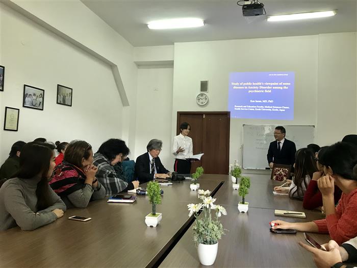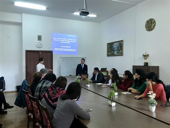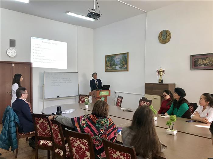 В рамках сотрудничества Казахского Национального Университета имени Аль-Фараби с университетами Kochi University (Япония) и Shimane University (Япония) 5 ноября 2018 года кафедрой эпидемиологии, биостатистики и доказательной медицины в факультете медицины и здравоохранения была проведена лекция профессора университета Кочи, Япония, MD, PhD Ken Inoue и профессора университета Шиманэ, Япония, MD, PhD Yoshihiro Noso. Профессор Ken Inoue рассказал о результатах исследования тревожного невроза психиатрической наклонности в Японии с точки зрения общественного здравоохранения. Тревожный невроз диагностируется у 5% населения, при этом, чаще развивается в молодом возрасте от 18 до 40 лет и у женщин чаще, чем у мужчин. Тревожный невроз нужно рассматривать как общемедицинскую проблему, так как такие состояния способствуют утяжелению течения соматических заболеваний. Профессор Yoshihiro Noso выступил с лекцией «Хирургия и общая медицина», рассказав о передовых направлениях профилактики хирургических инфекций в медицине. Присутствовавшие преподаватели и обучающиеся задавали интересующие вопросы.