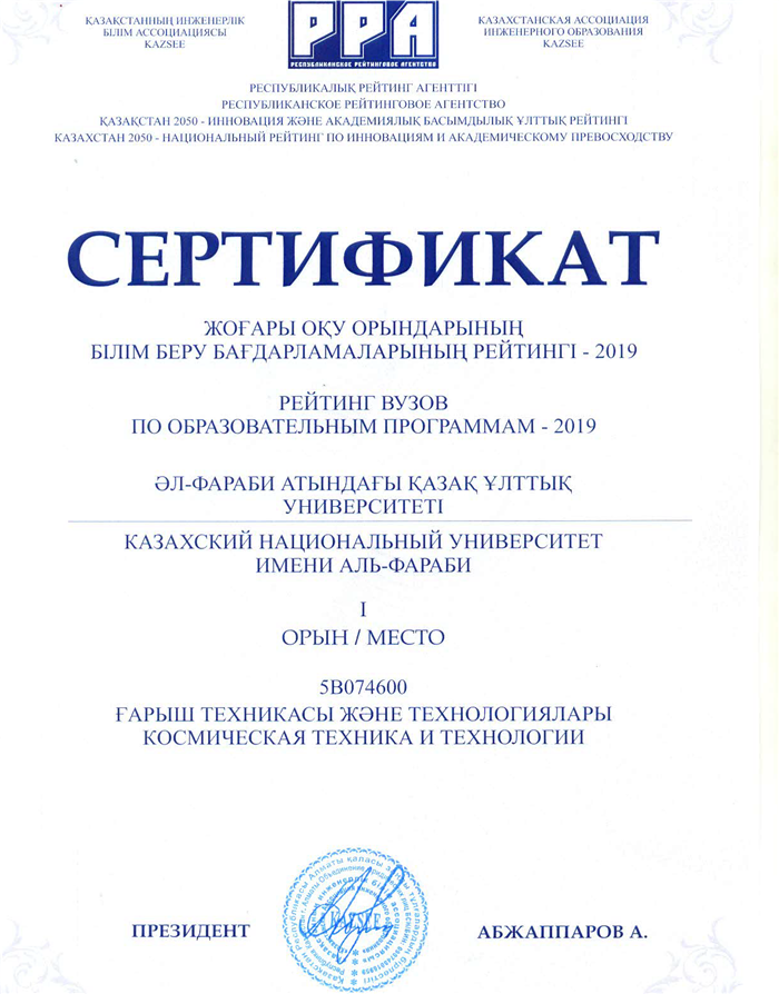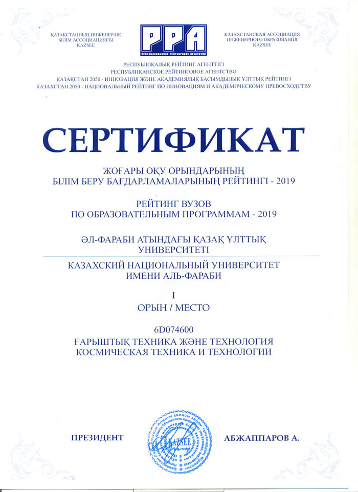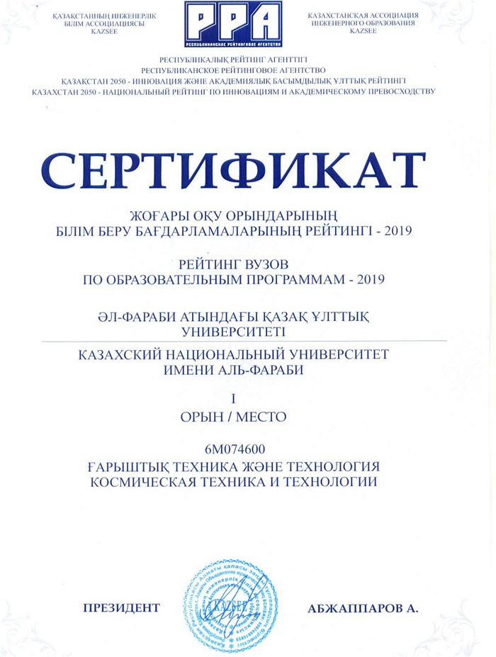 По итогам рейтинга вузов и образовательных программ «Казахстан-2050 – Национальный рейтинг по инновациям и академическому превосходству», проведенным Республиканским рейтинговым агентством Казахстанской ассоциации инженерного образования (РРА-KazSEE) в 2019 году Казахский национальный университет имени аль-Фараби занял первые места по образовательным программам: