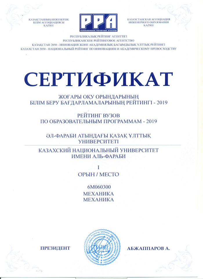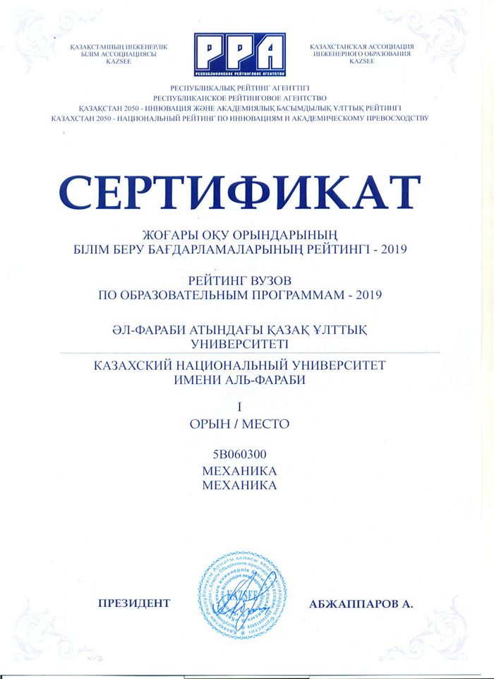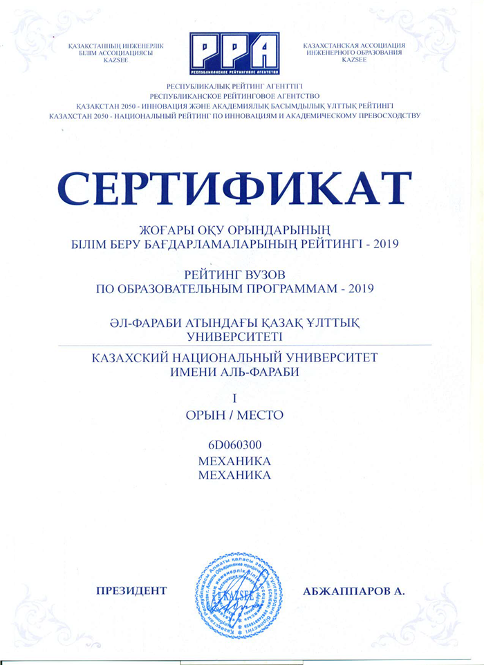 По итогам рейтинга вузов и образовательных программ «Казахстан-2050 – Национальный рейтинг по инновациям и академическому превосходству», проведенным Республиканским рейтинговым агентством Казахстанской ассоциации инженерного образования (РРА-KazSEE) в 2019 году Казахский национальный университет имени аль-Фараби занял первые места по образовательным программам: