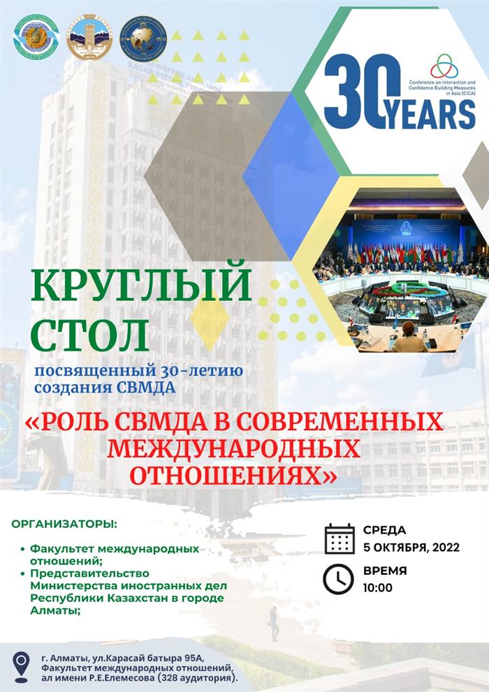 Факультет международных отношений КазНУ им. аль-Фараби совместно с Министерством иностранных дел Республики Казахстан проводят круглый стол «Роль СВМДА в современных международных отношениях».