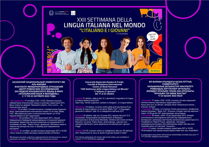 С 17 по 23 октября 2022 года на факультете международных отношений Казахского Национального университета им. аль-Фараби проводятся ряд мероприятий в рамках XXII-й недели итальянского языка в мире «Итальянский язык и молодёжь». Организатором выступает Центр романских исследований с профессиональным и дружным коллективом.