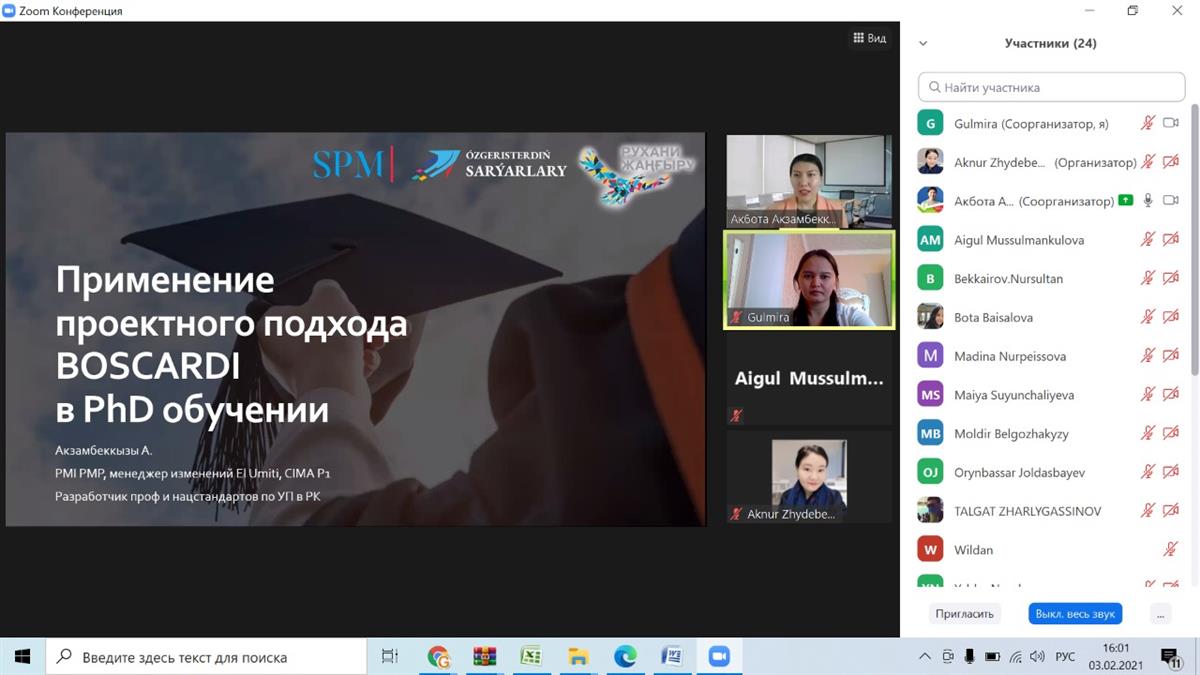 03.02.20213-го февраля 2021 года в Высшей школе экономики и бизнеса состоялся онлайн-семинар, организованный Советом молодых ученых, на тему: «Управление своим PhD обучением через проектный подход BOSCARDI». Спикер семинара: Акзамбекқызы Ақбота - PMI PMP, Лидер изменений "Ел Үміті", Директор ЦСС СПМ РК.