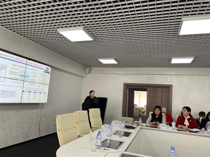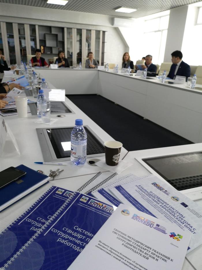 Институциональный координатор проекта Erasmus+ ENINEDU Жидебеккызы Акнур поделилась изученным опытом европейских стран по взаимодействию вузов и бизнес-сектора, а также призвала партнёров-работодателей ознакомиться со Стандартом и дать фидбэк по его содержанию.