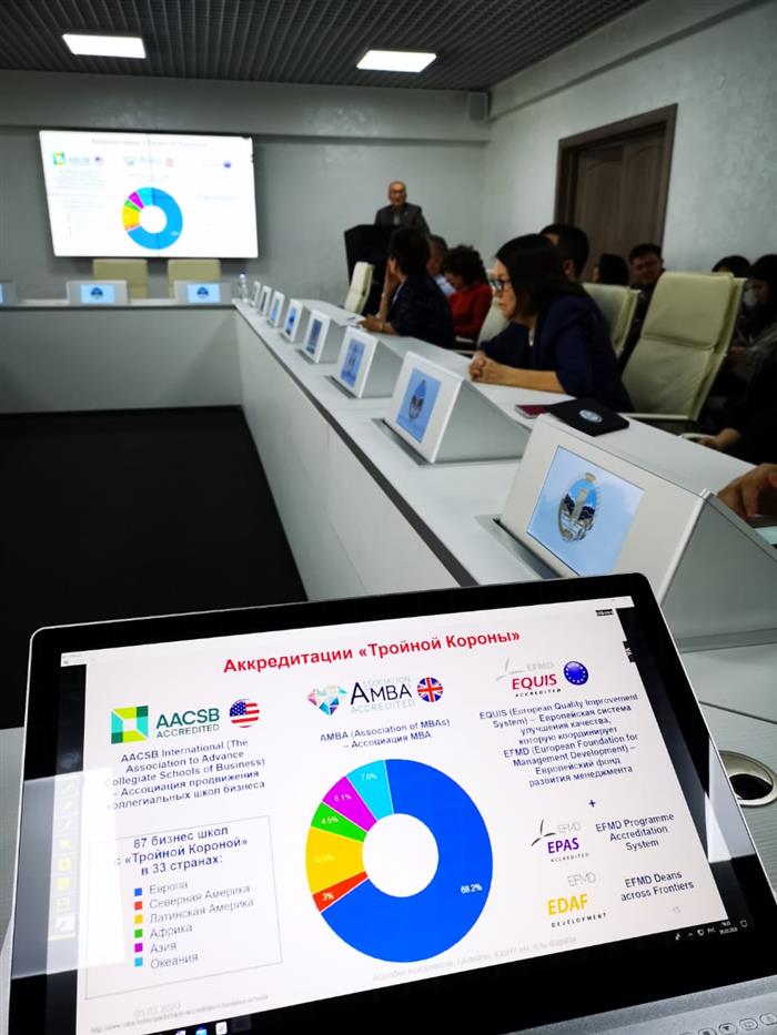 На встрече был рассмотрен обзор международных аккредитаций и глобальных рейтингов в бизнес-образовании, обсуждались современные тренды и вызовы бизнес-образования в Республике Казахстан, отличительные особенности предпринимательского университета и концепция третьей миссии университета в ХХІ веке. Участники встречи проявили особый интерес к опыту внедрения таких дисциплин, как «Дизайн жизни», «Service learning» и «Social coworking». Так же активную дискуссию вызвал вопрос о требованиях к преподавателям бизнес-школ.