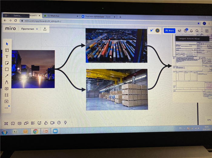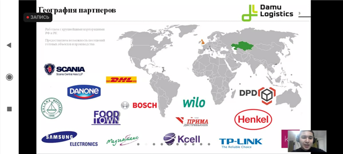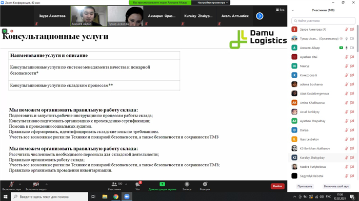 Во время встречи была проведена онлайн-экскурсия на склад компании DAMU Logistics (http://sklad.dlg.kz/). Студенты были ознакомлены с процессом практического выполнения логистических операций в интервале от приема поступившего товара до его отгрузки в продажу. Менеджер Анишев А.Е. ответил на вопросы студентов, которые касались прохождения практики и трудоустройства в DAMU Logistics, основных требований к сотрудникам компании и т.д.