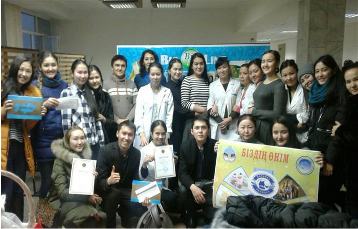 В рамках проекта «Айналаңды нұрландыр» участники кружка «Микробиолог» организовали для студентов 3 курса специальности «Биотехнология» конкурс по изготовлению национальных кисломолочных продуктов. Вконкурсепринялиучастие 9 команд (Mascot, Bioline, Premium, Organic, KazNatural, FreshFood, AFC, БиоFood, NaturalProduct). Победила команда «Bioline». Их продукция отличалась высокими вкусовыми качествами и была красиво оформлена (Бержанова Р.Ж. Сыдыкбекова Р.К., Бектилеуова Н.К., Мукашева Т.Д., Игнатова Л.В., Омирбекова А.).