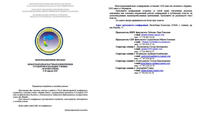Приглашаем Вас принять участие в работе в Международной конференции студентов и молодых ученых «Фараби Әлемі», которая будет проходить 9-10 апреля 2019 года на факультете биологии и биотехнологии Казахского Национального Университета имени аль-Фараби.