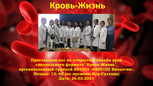 Приглашаем вас на открытый онлайн урок специального формата" Кровь-Жизнь", организованный кафедрой Биоразнообразия и биоресурсов, группой ББ1903, специальности «6В05102 Биология». Урок пройдет с двумя методами: