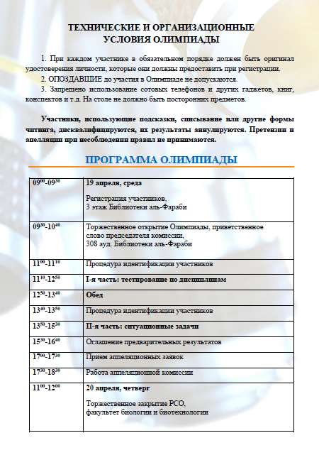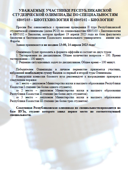 УВАЖАЕМЫЕ УЧАСТНИКИ РЕСПУБЛИКАНСКОЙ СТУДЕНЧЕСКОЙ ОЛИМПИАДЫ ПО СПЕЦИАЛЬНОСТЯМ 6B05103 – БИОТЕХНОЛОГИЯ И 6B05102 – БИОЛОГИЯ!