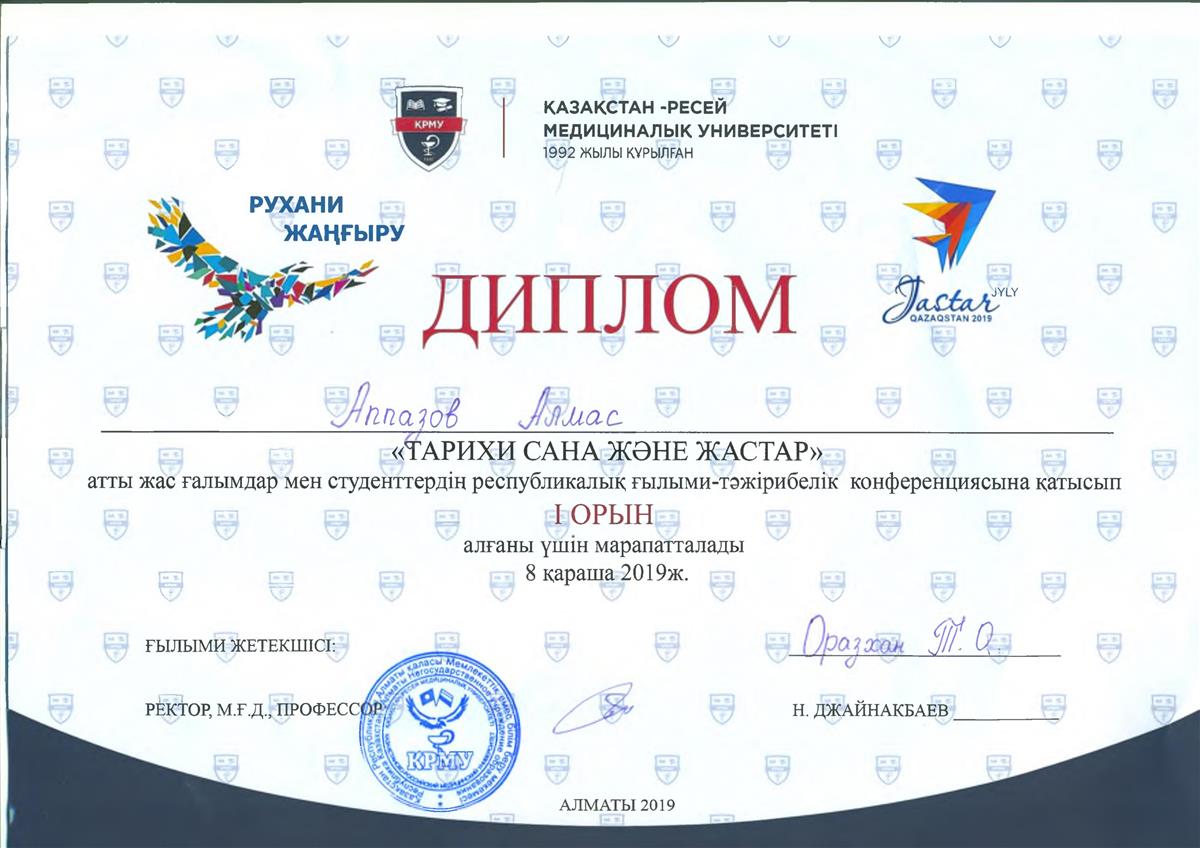 08.11.20198 ноября 2019 года на Республиканской научно-практической конференции молодых ученых и студентов «Историческое сознание и молодежь», организованной Казахско-Российским медицинским университетом Аппазов Алмас занял І место. Конференция прошла в городе Алматы.