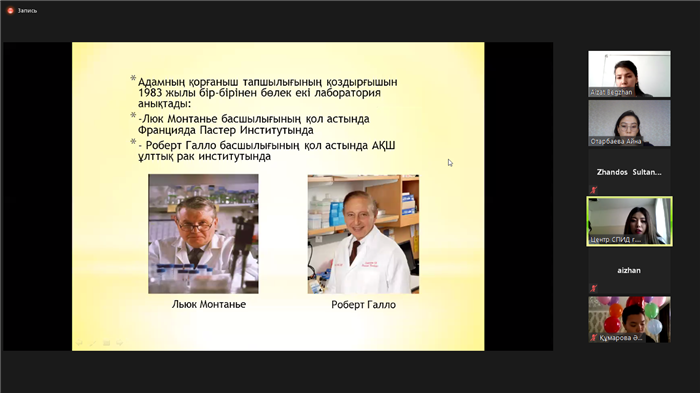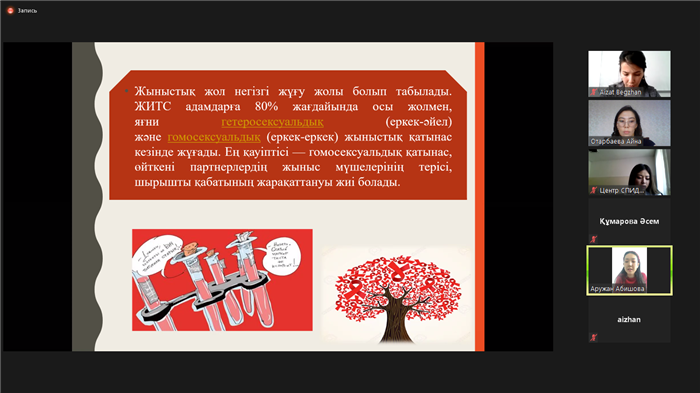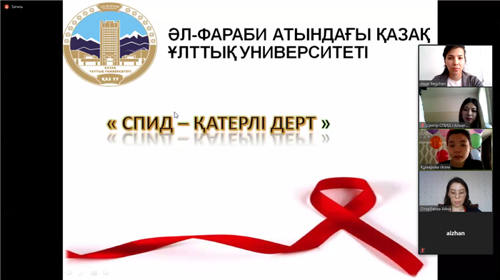 В рамках реализации программы "Рухани жаңғыру", с целью привития навыков здорового образа жизни, профилактики наркомании и деструктивного поведения среди студентов кафедрой международного права факультета международных отношений Казахского национального университета имени аль-Фараби была организована онлайн-встреча студентов с социальным врачом Центра по профилактике и борьбе со СПИД г.Алматы Үсенқұл Мадиной Мешірқызы, которая прочла лекцию на тему «Профилактика ВИЧ-инфекций». Участниками данного мероприятия явились студенты факультета международных отношений и юридического факультета КазНУ им.аль-Фараби, а также студенты специальности «Логистика» Университета Международного бизнеса. Данное воспитательное мероприятие было проведено для того, чтобы разъяснить слушателям пути заражения вирусом иммунодефицита человека, повысить уровень знания о ВИЧ-инфекции, познакомить с мерами профилактики заражения ВИЧ-инфекции, развить положительное отношение к ВИЧ-инфицированным больным. В ходе встречи представитель СПИД центра подробно рассказала о путях передачи вируса, его свойствах и развитии, мерах профилактики, где можно пройти бесплатное обследование, а также ответила на все вопросы студентов. Слушатели получили много полезной и новой информации о вирусе, который приводит к развитию СПИДа – смертельно опасной болезни, разрушающей иммунитет человека. Также студентки Кумарова Асем и Абишева Аружан, проявившие особый интерес, подготовили презентации и выступили с докладами по теме онлайн-встречи. Самым главным результатом онлайн мероприятия стало то, что каждый слушатель сделал для себя вывод — ответственное поведение и здоровый образ жизни – основа профилактики ВИЧ-инфекции.