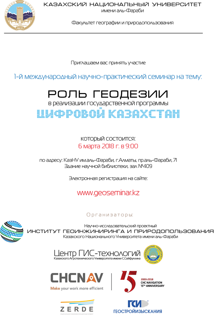 6 марта 2018 года в здании научной библиотеки КазНУ им. аль - Фараби пройдет I Международный научно-практический семинар «Роль геодезии в реализации государственной программы Цифровой Казахстан» с участием зарубежного разработчика и производителя навигационных систем компании Shanghai HuaCe Navigation с брендом CHCNAV.