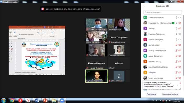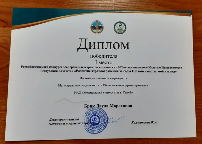 22 декабря состоялось торжественное онлайн объявление победителей Республиканского конкурса эссе на платформе Zoom. Онлайн приглашения на наше собрание были отправлены заранее на сайты университетов и студентам, участвовавшим в конкурсе. В 11: 00 наше торжественное собрание началось с видеоролика посвященным достижениям здравоохранения Республики Казахстан за 30 лет. Почетным гостем нашего собрания стал директор Высшей школы общественного здравоохранения факультета медицины и здравоохранения, кандидат медицинских наук Даниярова Анара Бахыткереевна. Заведующая кафедрой политики и организации здравоохранения, профессор Капанова Гульнара Жамбаевна тепло поприветствовала всех присутствующих студентов и пожелала им удачи. 1 место занял магистрант НАО "Медицинский университет Семей" - Брик Лаула Маратовна по специальности “Общественное здравоохранение”. 2 место занял Ережепов Бекет магистрант 2 курса по специальности "Общественное здравоохранение" Западно-Казахстанского медицинского университета имени Марата Оспанова. И 3 место заняла Омарова Индира – магистрант 1 курса университета по специальности "врач-исследователь". Магистрантам были торжественно вручены дипломы и памятные подарки. 1 место получил в подарок две книги Ремарка Э. М, 2 место – роман Донны Тарт “Щегол”, 3 место-книга И. Есенберлина “Кочевники”. Магистранты, занявшие призовые места, выразили огромную благодарность организаторам!