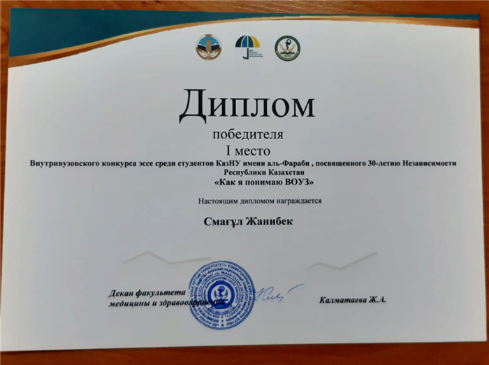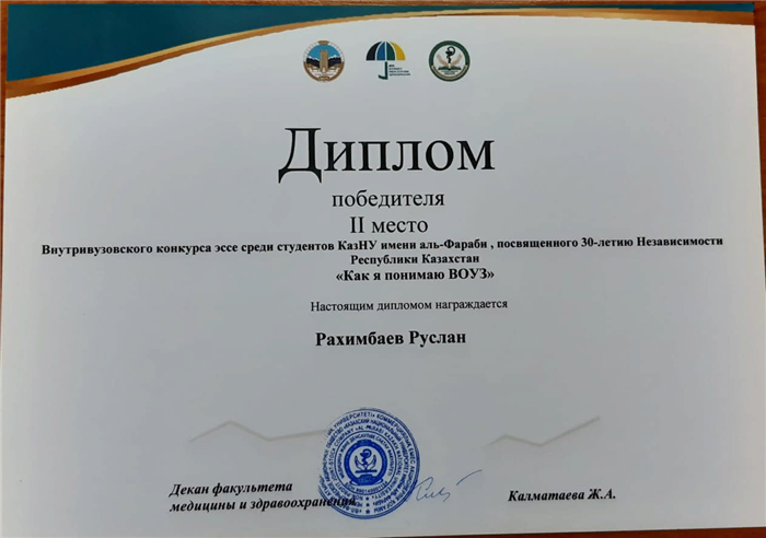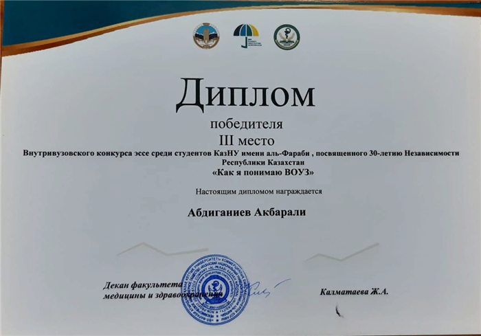 21 декабря 2021 года, в Казахском национальном университете им.Аль-Фараби, кафедра политики и организации здравоохранения в торжественной обстановке огласила результаты внутри университетского конкурса эссе среди студентов на тему: "как я понимаю ВОУЗ". Конкурс эссе, а так же церемения награждения , всвязи с пандемией в стране, проводилось в онлайн-формате в платформе Zoom. Со дня объявления конкурса студенты отправляли свои эссе на почту konkurs.essay@mail.ru в соответствии с требованиями конкурса. В конкурсе приняли участие 25 студентов из разных факультетов нашего университета. Все работы были интересны. Участники старались не только осветить проблемы и достижения, но и предложить пути решения некоторых проблем, а также были освещены вместе с достижениями и упущенные возможности.