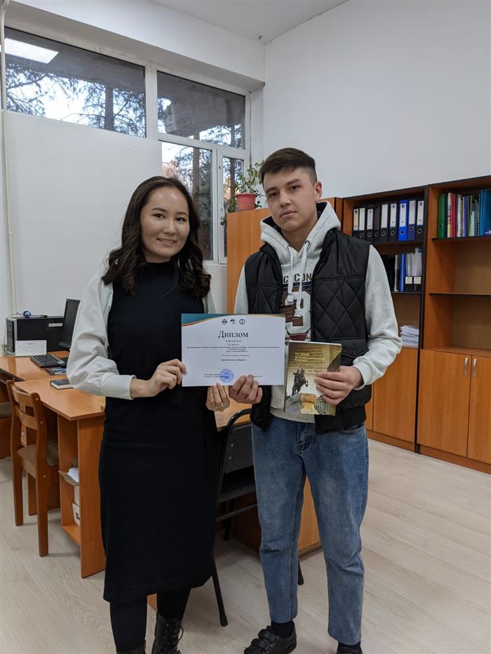 Призовое 1 место присвоили студенту 3 курса специальности «иностранная филология» филологического факультета – Смагулу Жанибеку. В качестве подарка победителю был вручен диплом 1 степени и памятный подарок роман Мухтара Ауэзова "Путь Абая". Так же студент нашего университета Руслан Рахимбаев - занял 2 место, студент 2 курса факультета медицины и здравоохранения Абдиганиев Акбарали занял 3 место. Всем трем победителям были вручены специальные дипломы и памятные подарки. Рахимбаеву Руслану была вручена книга автора Дюранта.У «Уроки истории», а Абдиганиеву Акбарали, занявшему третье место, была вручена книга профессора-эндокринолога М. Е. Зельцера «Вплески памяти на дневниковых страницах». «-Мы не зря выбрали в качестве призов- книги. Надеемся, что выбранные нами произведения известных писателей помогут студентам в дальнейшем развивать литературный талант, обогащать свой кругозор и возможность ближе прикоснуться к шедеврам мировой литературы.»